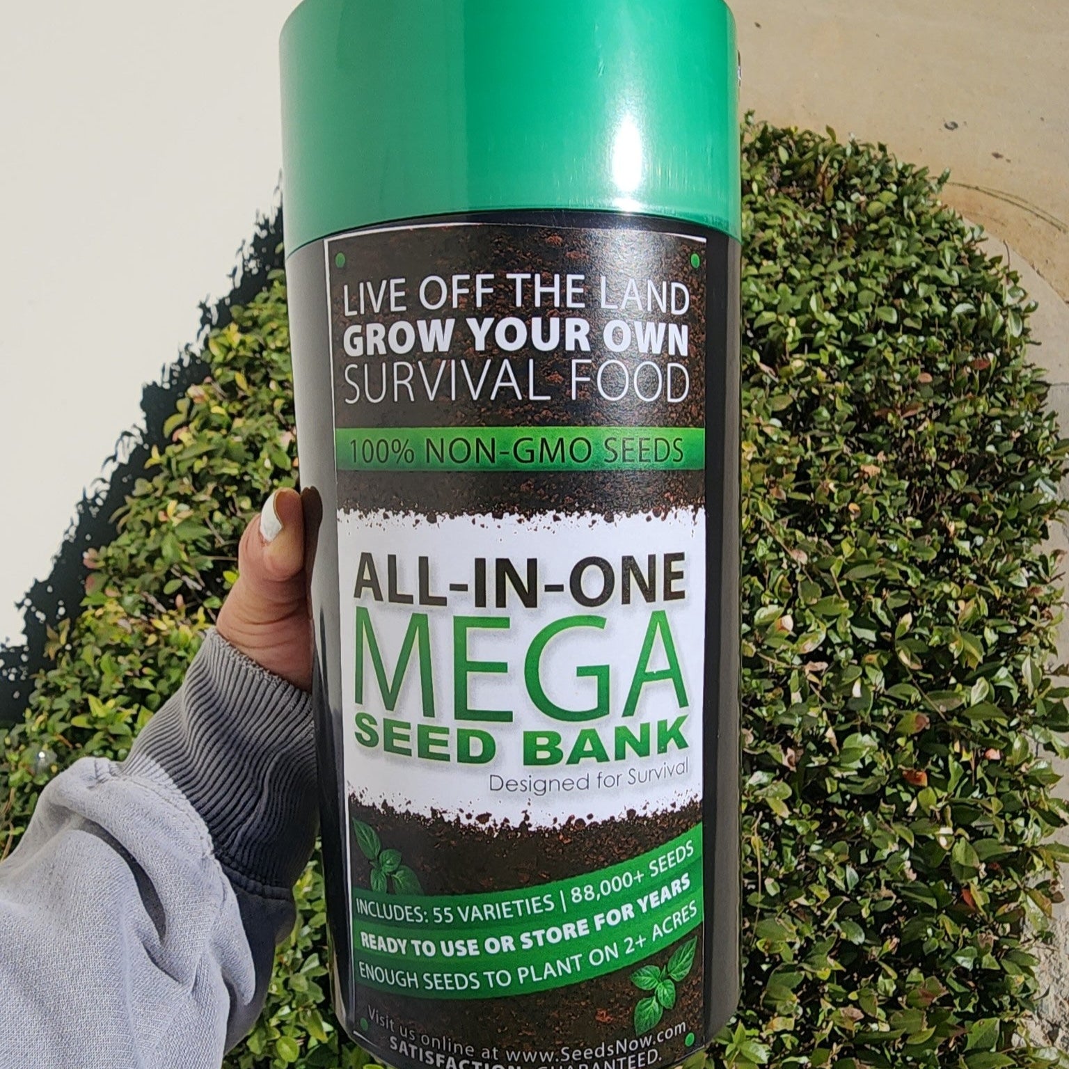 The MEGA Seed Bank is our biggest Seed Bank ever! With 55 unique seed varieties and over 58,000 seeds! It is designed for survival & long-term storage featuring a large Seed Storage Vault, which is a heavy-duty air tight seed storage container. Container measures: 10.5" (H) x 4.75" (W). Provides superior moisture barrier + pest, insect, and rodent resistant. Freezer safe.. It is one of our highest-rated and most popular products, and can produce organic NON-GMO fruits, vegetables and herbs when seeds no longer become available and/or if there are severe shortages in supply.